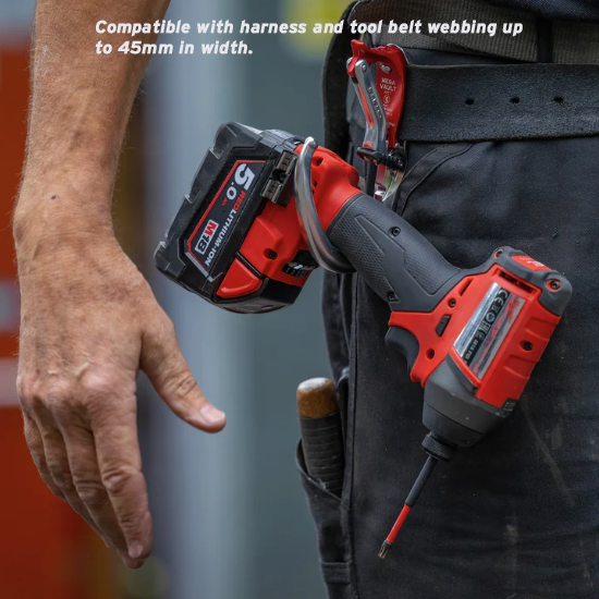 Compatible with handle/attachment point of many tools, for example chainsaws, ladders and cordless tools such as impact drivers or drills.